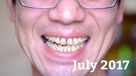 わかりづらいですが、向かって右の前歯は透明ゴムじゃなくて白い針金で固定されています。これと同じ処置を下顎の犬歯とその次の歯にもしています。 正中線ずれてますねー。