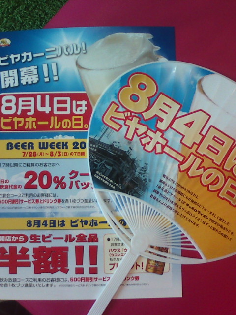 8月4日はビアホールの日.会社ビルの「銀座ライオン」にでかでかとPRされているのですっかり刷り込まれてしまった,8月4日はビアホールの日.日本で始めてビアホールがオープンしたのが明治32(1899)年8月4日だそうで,来週の8月4日は全国のライオンでビールが半額です.もちろんワタシも飲む予定.会社帰りに.罪深い.残業して働く人々の足元(地下一階)でビールをたらふく飲むのが罪深い.