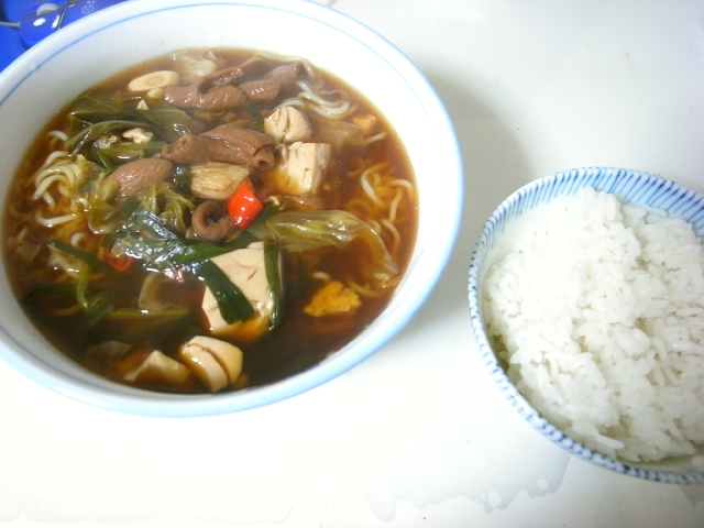 で二杯いただき,その後ラーメン煮込んでライスとともに頂き,すっかり満腹に