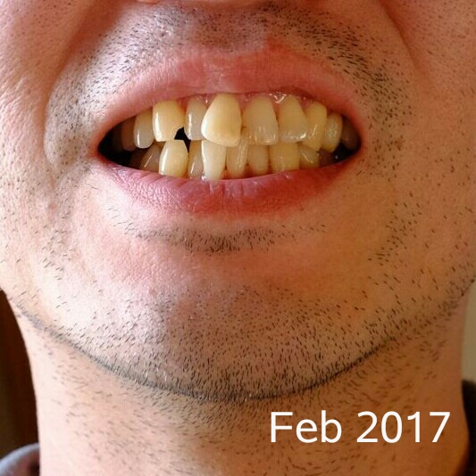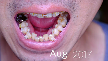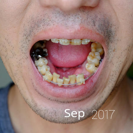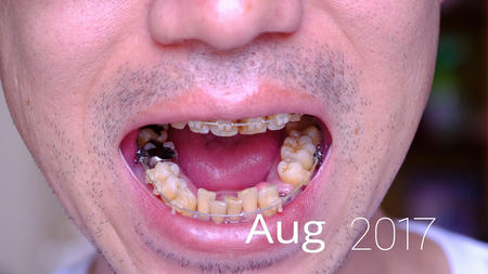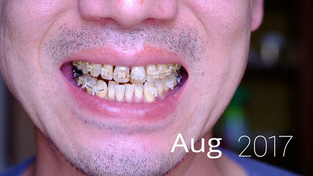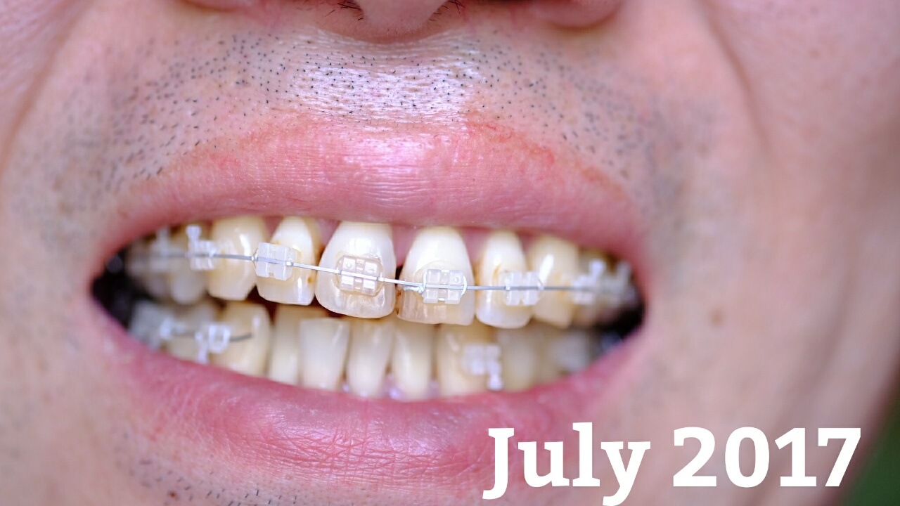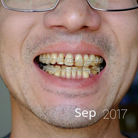 今回は下顎はいじらず、ゴムの交換だけ。抜歯後の犬歯と5番は継続して透明なチェーンのよなもので結んでいます。でも、どちらも動く気配がありません。まだ抜歯した隙間はそのままです。本来は犬歯がもっと後退したほうがいいような。