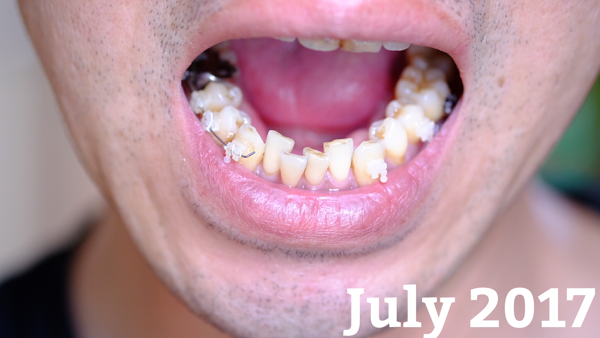 えっと、下の歯列は前歯4本にまだブラケットがついてないので、ほぼこれが原型です。犬歯以降奥歯まではレベリングで捻じれを直したりしていますが、下は前歯以外はそれほど捻じれてなかったです。